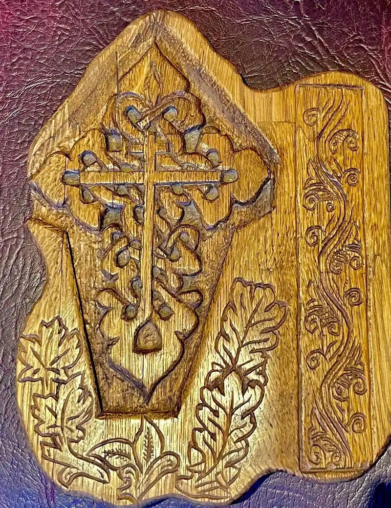 Wooden relief depicting a cross surrounded by floral ornaments, hand-carved with sacred symbolism.